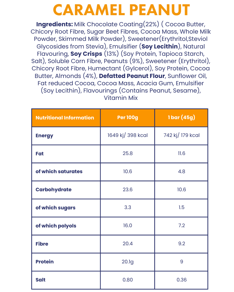 Ingredients: Milk Chocolate Coating(22%) ( Cocoa Butter, Chicory Root Fibre, Sugar Beet Fibres, Cocoa Mass, Whole Milk Powder, Skimmed Milk Powder), Sweetener(Erythritol,Steviol Glycosides from Stevia), Emulsifier (Soy Lecithin), Natural Flavouring, Soy Crisps (13%) (Soy Protein, Tapioca Starch, Salt), Soluble Corn Fibre, Peanuts (9%), Sweetener (Erythritol), Chicory Root Fibre, Humectant (Gylcerol), Soy Protein, Cocoa Butter, Almonds (4%), Defatted Peanut Flour, Sunflower Oil, Fat reduced Cocoa, Cocoa Mass, Acacia Gum, Emulsifier (Soy Lecithin), Flavourings (Contains Peanut, Sesame), Vitamin Mix .