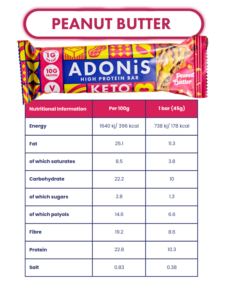 Your Keto-friendly Adonis Peanut Butter & Cocoa Bar — 10.3g protein, only 3.5g net carbs, low sugar and that signature Adonis crunch.