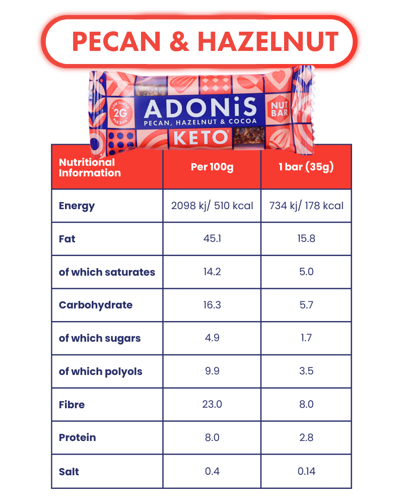 Your Keto-friendly Pecan, Hazelnut & Cocoa Nut Bar — low sugar, plant-based, high in fibre and packed with rich nut and cocoa flavour.